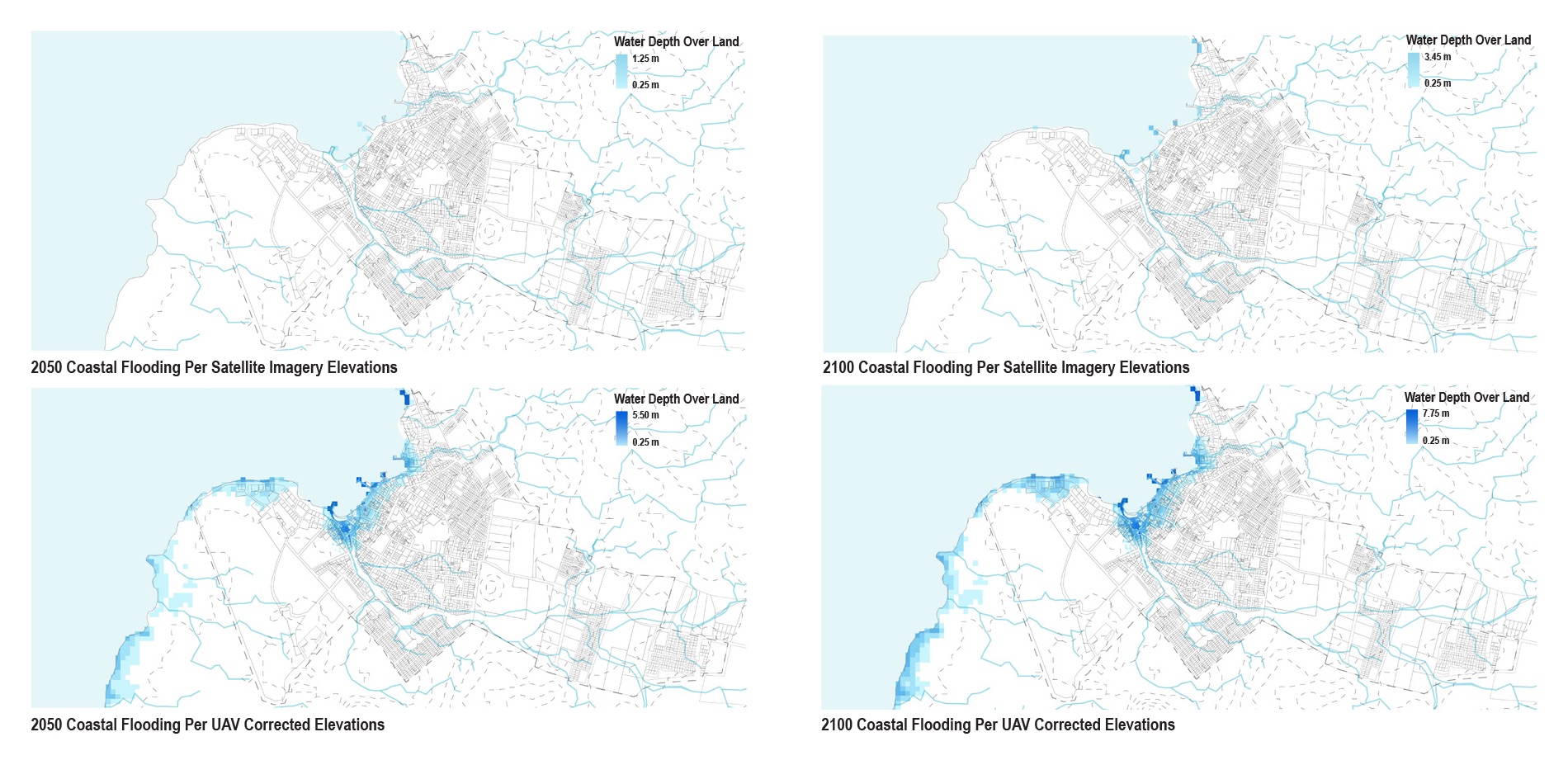 The height of San Cristóbal’s terrain is presently calculated through satellite imagery (top). When corrected with our survey data (bottom), the extent of possible future storm surge over land is much higher than if modeled with satellite elevation data.