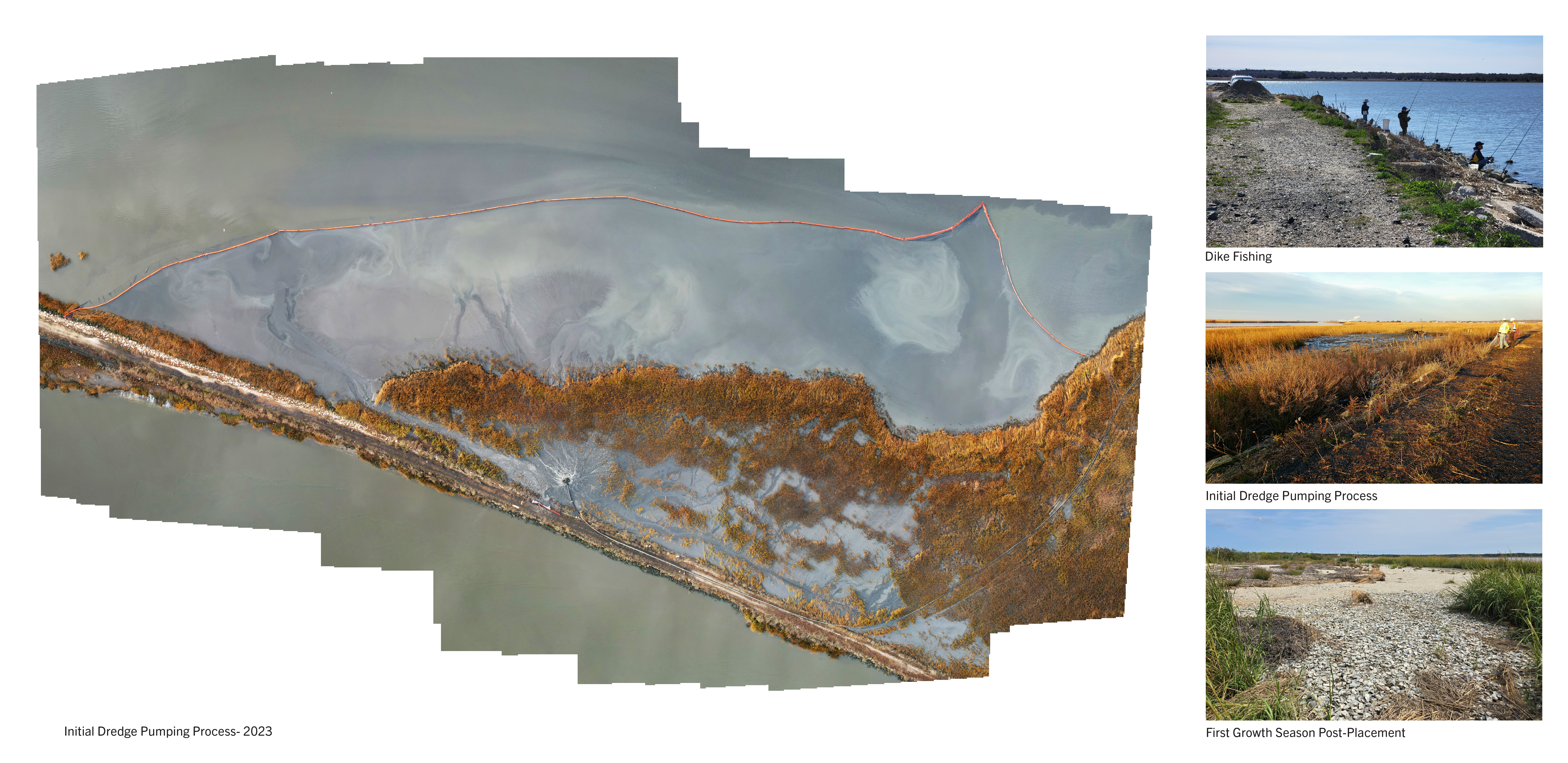 Images of dredge placement to increase marsh elevation against losses due to rising sea levels