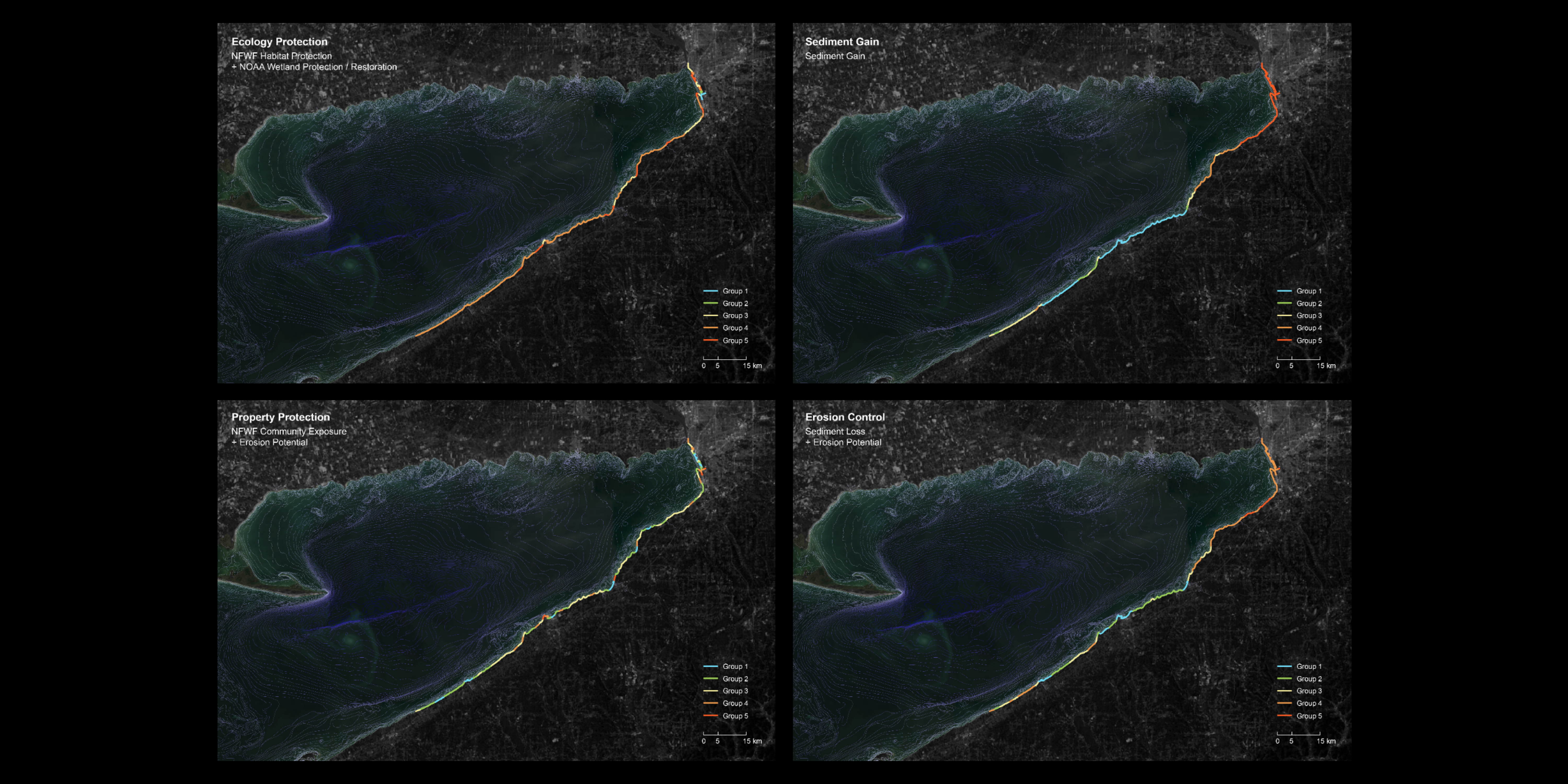 To target specific priorities, our simple models can be strategically combined. The above maps show the combination of models to produce coastal units relevant to Ecological Protection, Property Protection, Sediment Gain, and Erosion Control.